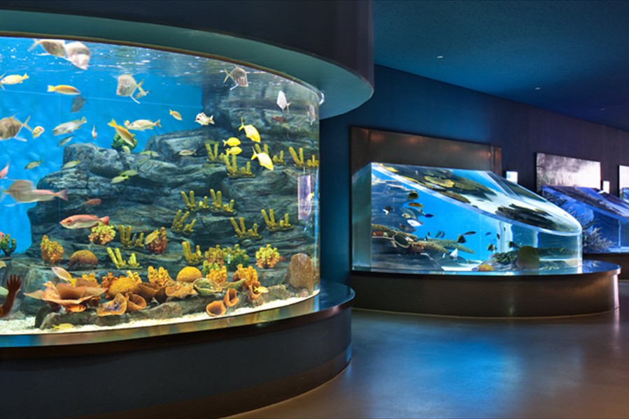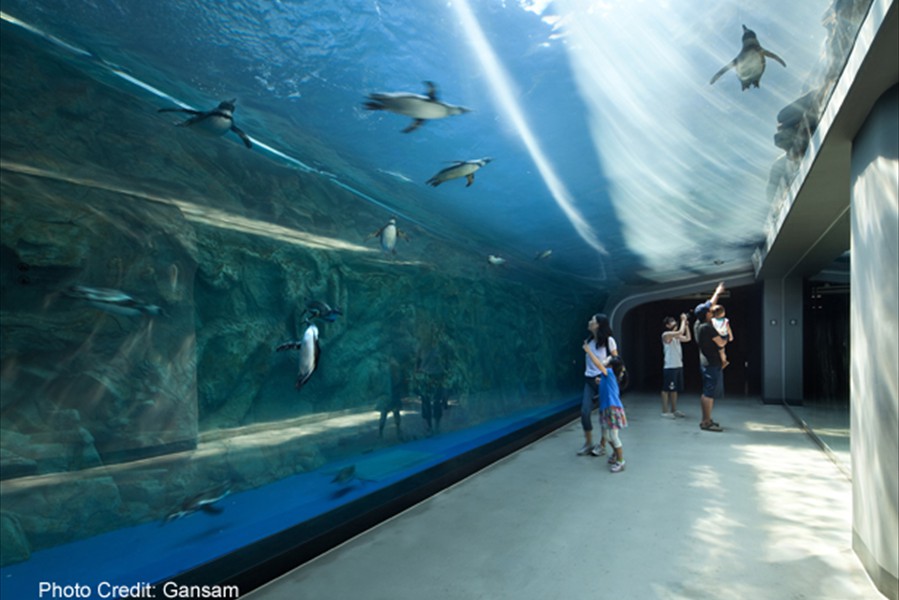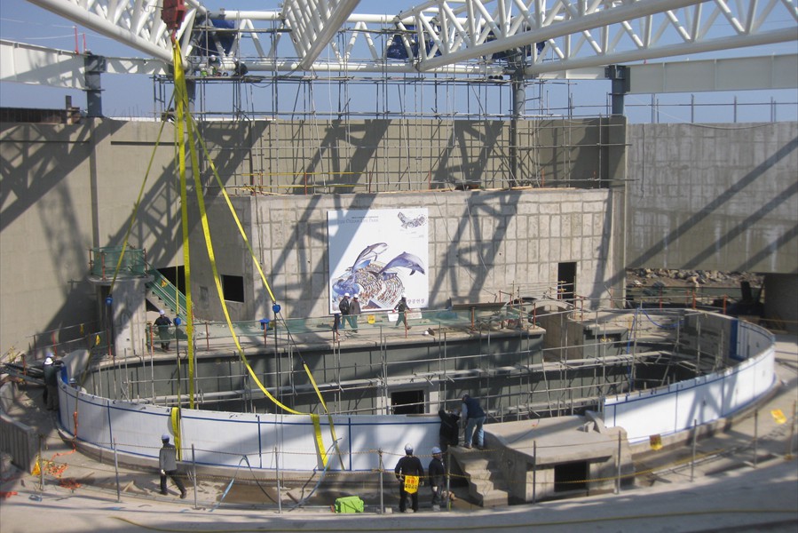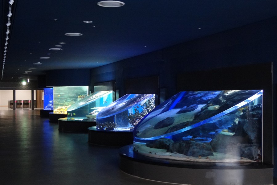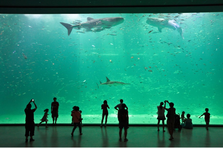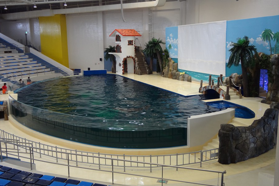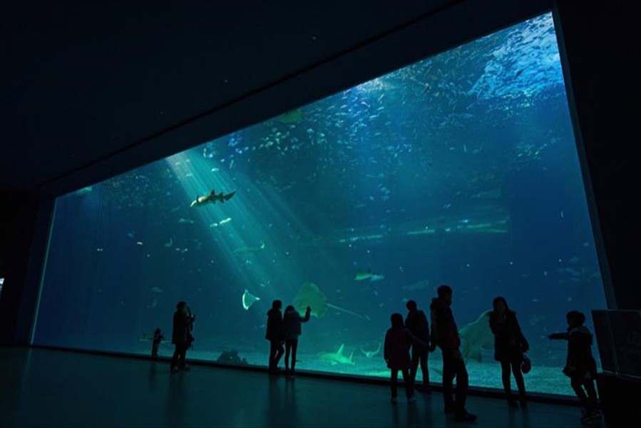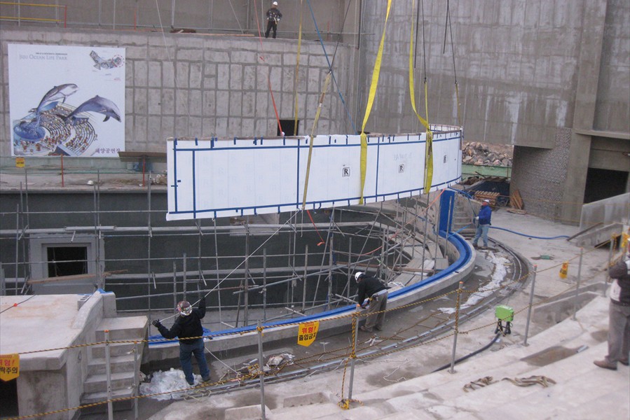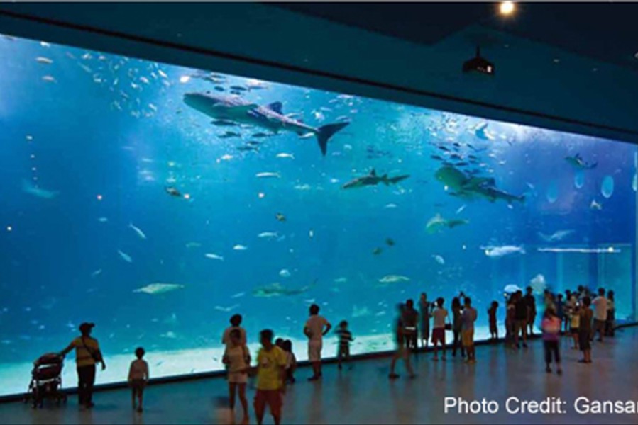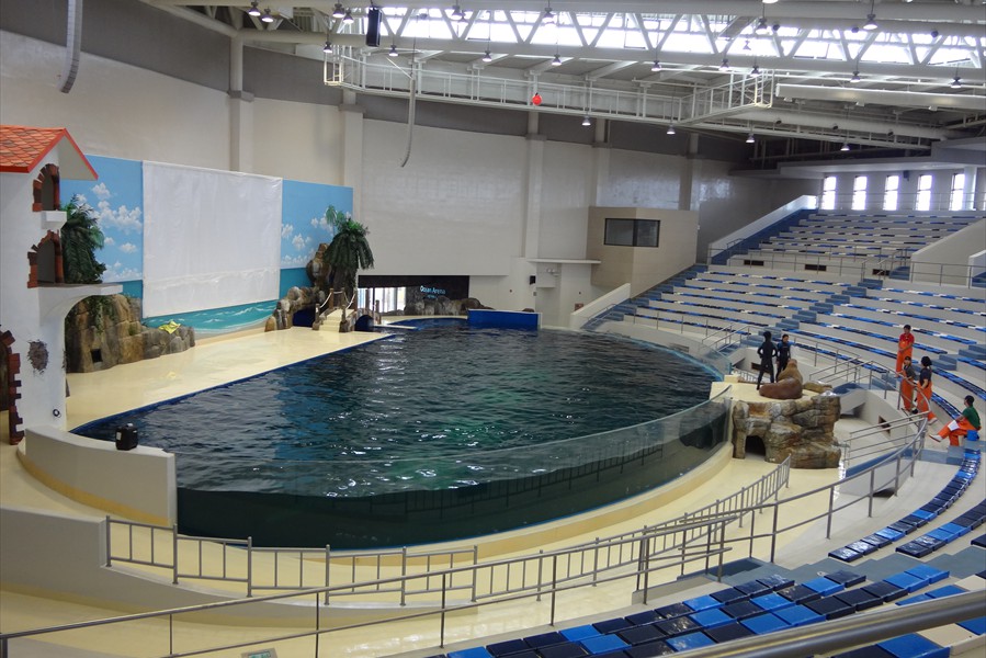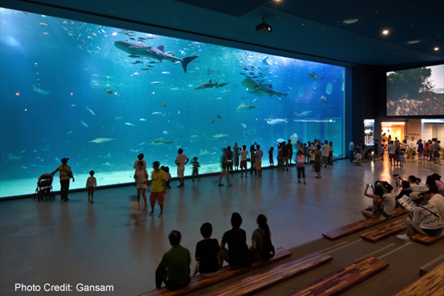 Facts: The new Aqua Planet Jeju at Seogwipo (South Korea) takes the crown from Okinawa Churaumi Aquarium (Japan). With a combined water volume of 10,800 tons, Aqua Planet Jeju is now Asia's largest public aquarium. In a classic example of one-ups-man-ship, the new Aqua Planet Jeju in South Korea has bested Okinawa Churaumi Aquarium with both a larger display tank and the largest total volume of any Asian public aquarium.  Aqua Planet Jeju's main tank features a 23 x 8.5 meter acrylic viewing panel (75 x 28 ft) ... bigger than Okinawa's but just barely.  The total water volume of Aqua Planet Jeju's tanks weighs in at an impressive 10,800 tons, again barely beating Okinawa's 10,500 tons. Besides the 6,000 ton main saltwater exhibit, Aqua Planet Jeju will feature many other fresh and saltwater displays including a walk-through aquarium tunnel. We have no word on Aqua Planet Jeju's stocking plans for their main tank, although we suspect they will also exhibit crowd-pleasing whale sharks like Okinawa.  But imagine if the curators turned it into a massive coral reef display, complete with whale sharks and manta rays to please the crowd.